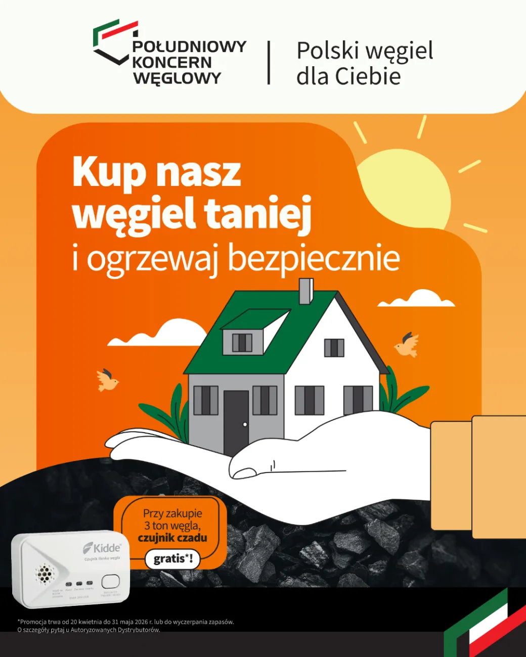 Wiosenna akcja Południowego Koncernu Węglowego S.A. skierowana jest do klientów indywidualnych, którzy chcą przygotować się do kolejnego sezonu grzewczego z wyprzedzeniem. Promocja ma charakter ograniczony i obowiązuje do 31 maja 2026 roku lub do wyczerpania puli czujników. Akcja „Kup nasz węgiel taniej i ogrzewaj bezpiecznie” jest elementem działań spółki promujących odpowiedzialne i bezpieczne ogrzewanie gospodarstw domowych oraz zwiększających świadomość zagrożeń związanych z tlenkiem węgla.